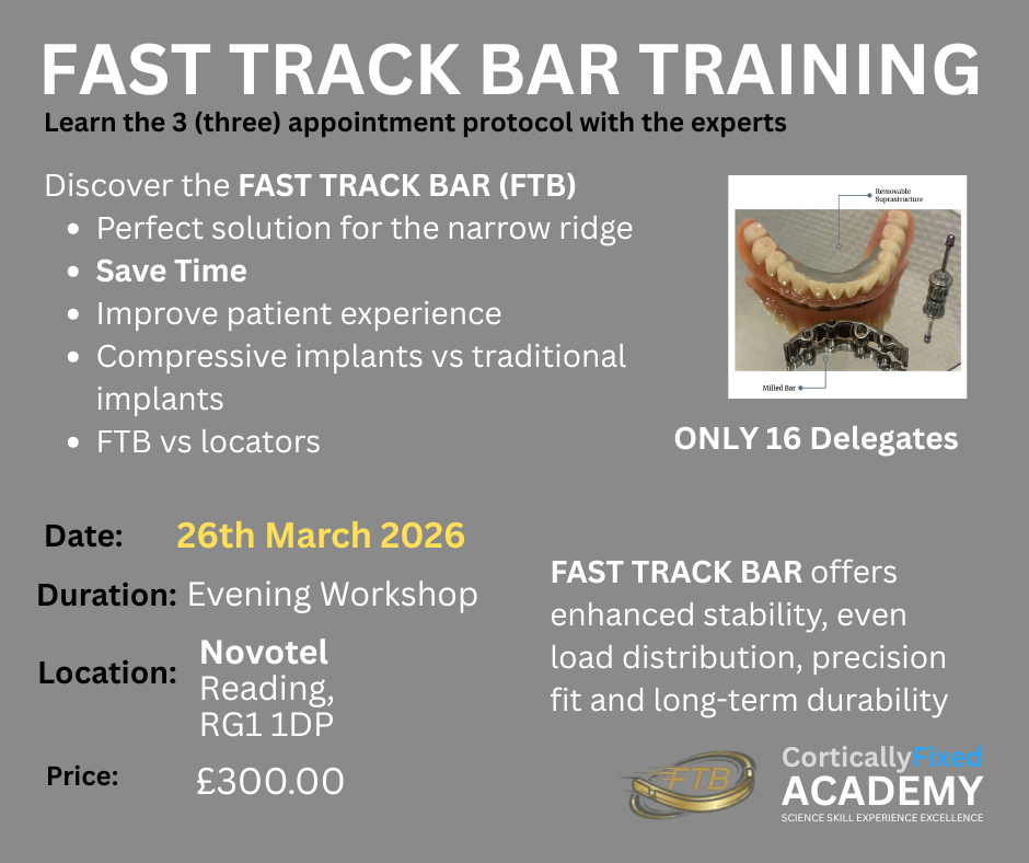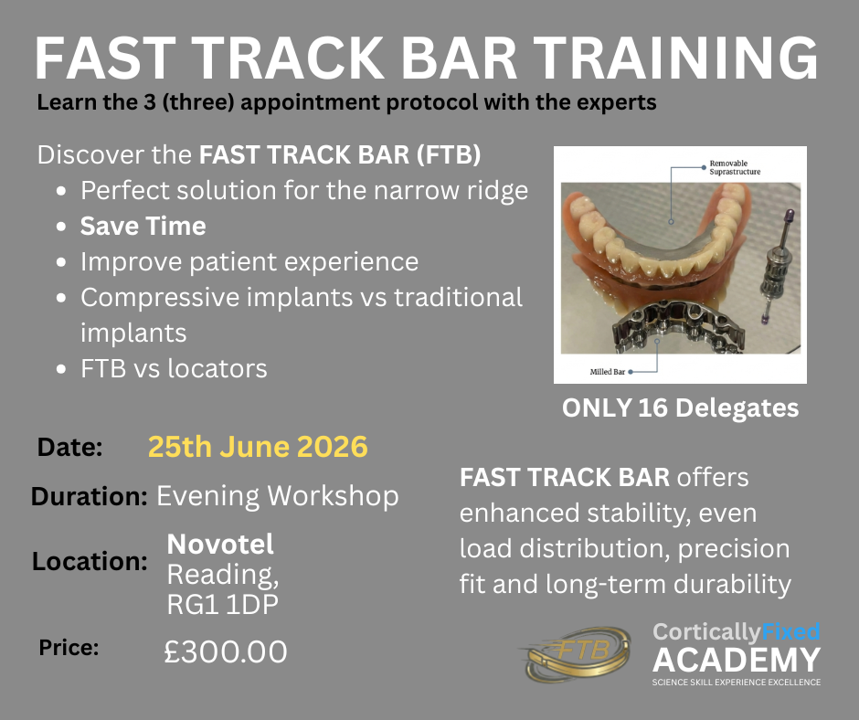 Who should do this training? This is a Practical Implant Placement solution for patients with narrow ridges. The Fast-Track-Bar is a technique that uses as bar-retained overdenture to provide strong stability even in cases of severe bone atrophy.