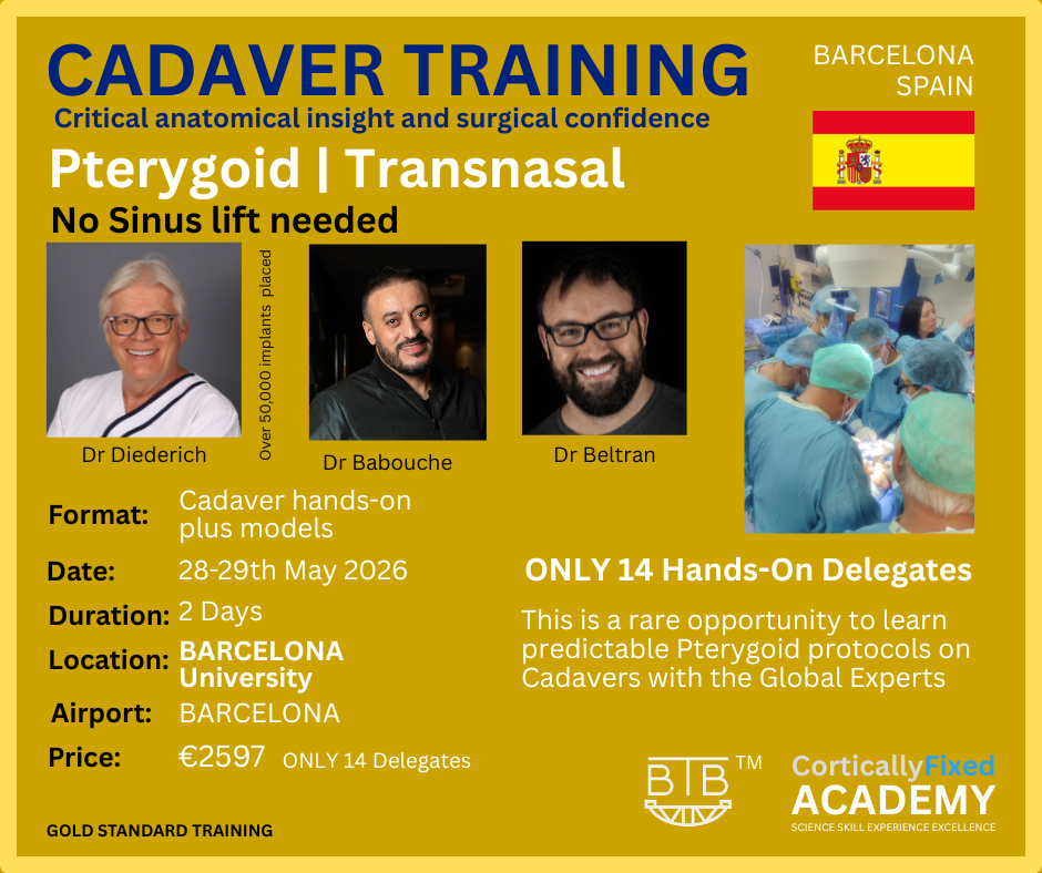 Pterygoid Mastery: Learn directly from Dr. Diederich and gain the expertise to utilise Pterygoid implants enabling you to avoid sinus lifts and bone grafting while expanding treatment options.